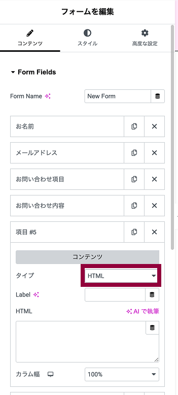 ここで、フォームに新しい項目を追加してHTMLを選びます。